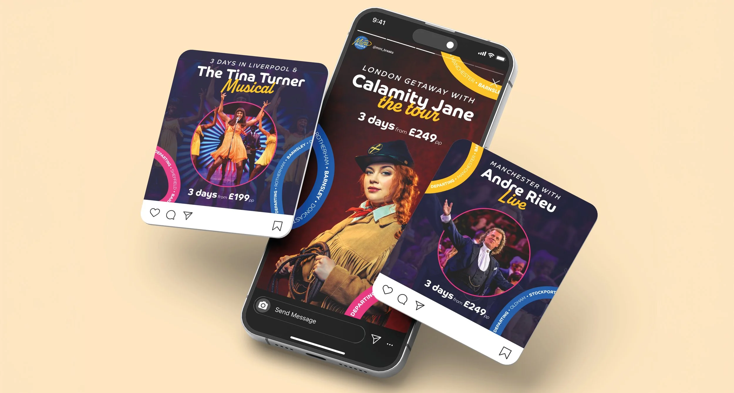 I was tasked with creating the full campaign concept for this new range. The objective was to clearly communicate its key USPs from the outset: a streamlined pickup system with a maximum of seven local points to reduce travel time, budget-friendly 3-day breaks ideal for new travellers, and a curated selection of theatre and event options including shows like Tina Turner and ABBA.
