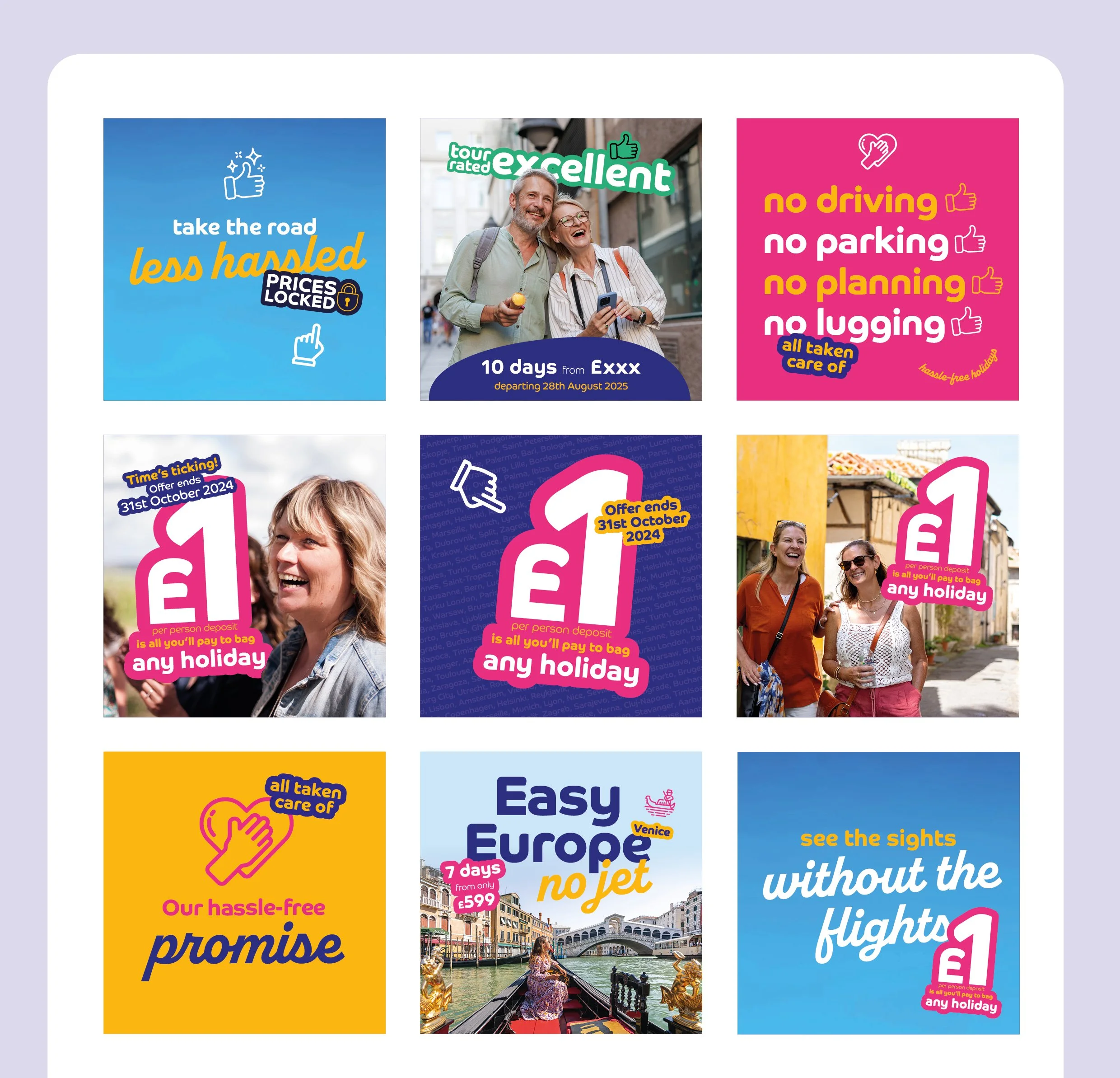 The modular design works both standalone and alongside other content, ensuring clarity and consistency across paid social, print, and email campaigns. The playful bubble shape differentiates Shearings from competitors and reinforces the brand’s friendly, approachable personality.